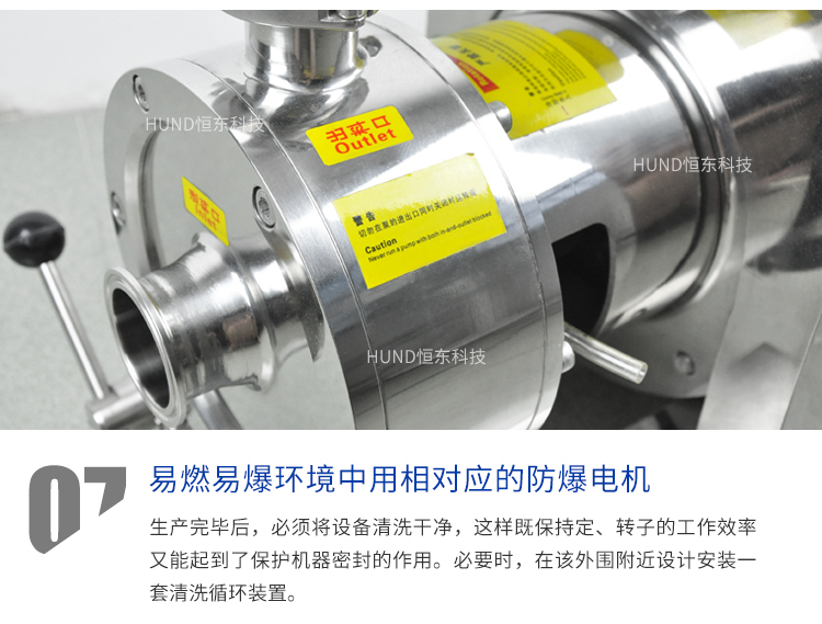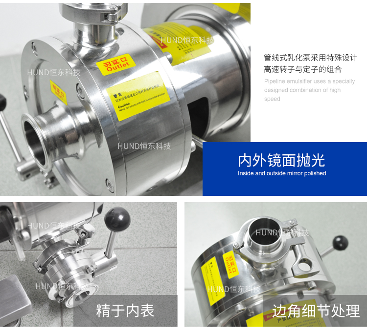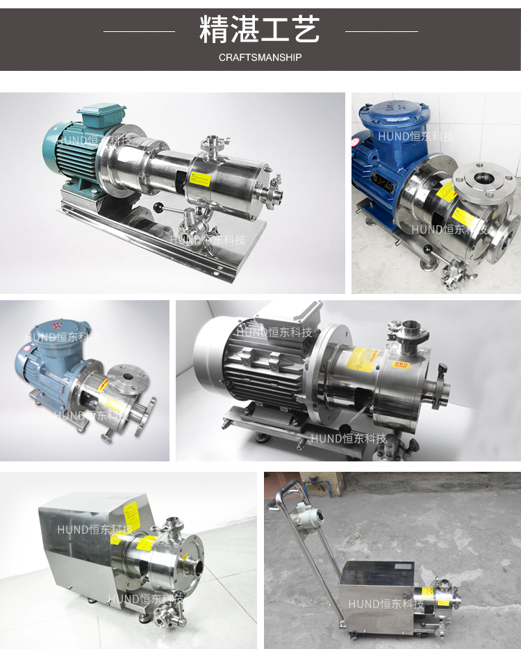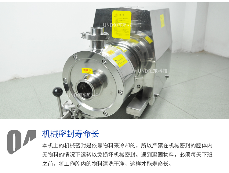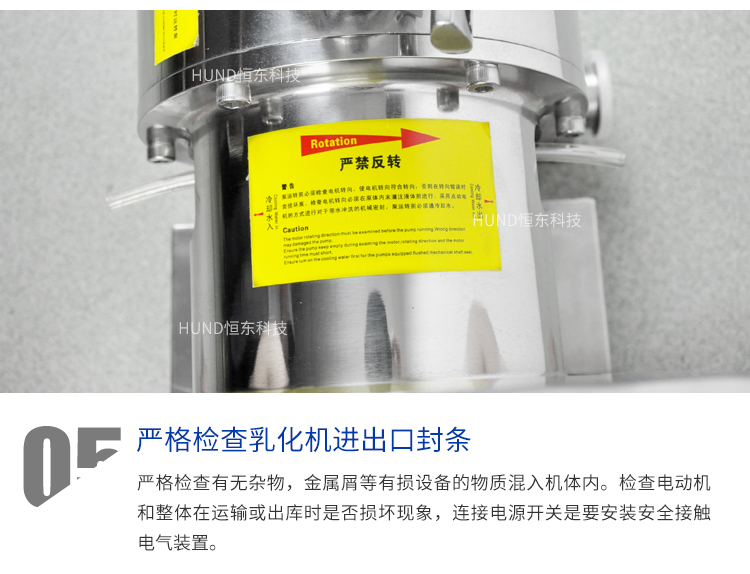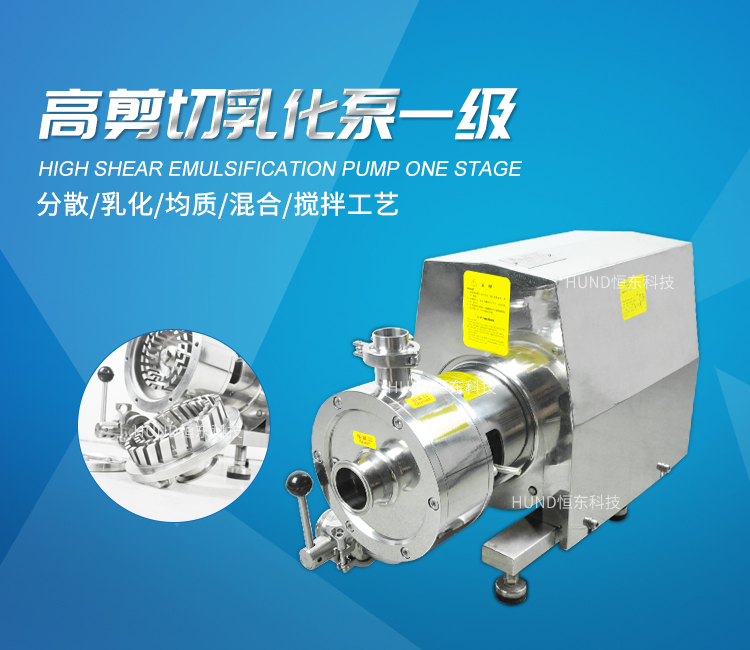 高剪切乳化泵的注意事項:1、乳化泵放置地要平穩,避免高低起伏而帶來不必要的撞擊;2、高剪切乳化泵在使用時操作人員要對其電源進行檢查,看看插頭是否正确聯接;3、操作人員要明白在沒有液體進入乳化泵的泵腔中,如沒有則立即停止該工作,其防止損壞機械密封;4、乳化泵使用時有的物料流動比較差,例如粘度性比較高的,建議采用相匹配的設備進行輸送。5、若是乳化泵體上轉向與設備上的紅色箭頭的方向出現偏差,要檢查物料是否進入腔體内,等調整好乳化泵的轉向後确定後再啓動電機。 乳化泵可安裝在生産線上的管路上使用,可安裝循環管單獨使用,也可與攪拌罐串聯循環使用。 乳化泵還可增設保溫層、選用防爆電機、清洗裝置等。