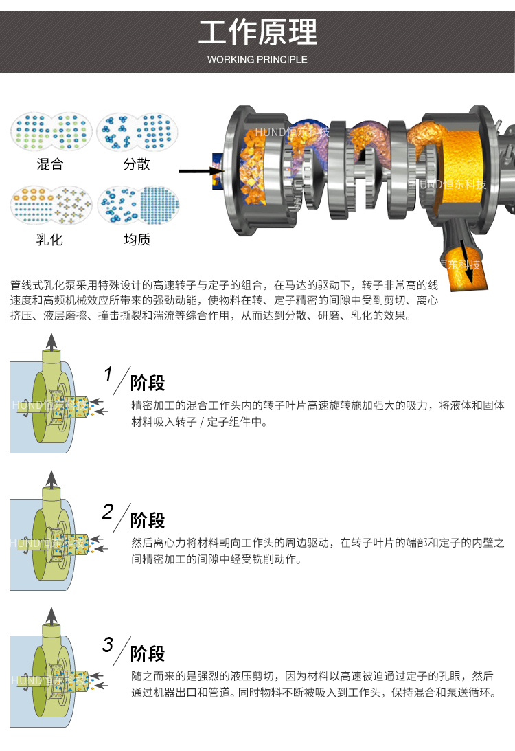 乳化泵管線高剪切分散乳化機是用于連續生産或循環處理精細物料的高性能設備,在乳化泵狹窄空間的腔體内,裝有1-3組對偶咬合的多層定、轉子、在電機的驅動下高速旋轉生産強勁的軸向吸力将物料吸入腔體。乳化泵能在短時間内對物料進行分散、剪切、乳化處理,粒徑分布範圍也顯著變窄,由此可制得精細的長期穩定的産品。建議與間歇式高剪切分散乳化機同時使用,處理效果更好。